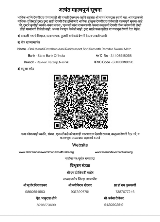 या विश्वस्तांच्या अधिपत्याखाली, मंदिराचा जिर्णोद्धार, संगमावर रामदास स्वामींचे भव्य स्मारक, लाईट साऊंड शो, परिसराचे सुशोभिकरण इ. मंदिराच्या विकासाचे काम करण्यात येत आहे. या कामात लोकसहभाग अत्यंत महत्वाचा आहे. यावस्त आपण वरील आवाहन स्वीकारून सहकार्य करावे ही विश्वस्तांतर्फे नम्र विनंती.