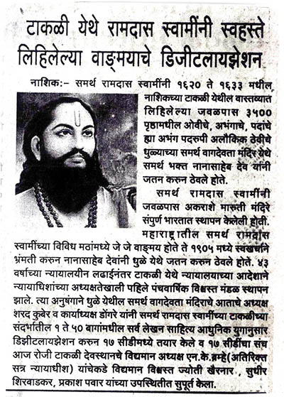 टाकळी येथे रामदास स्वामींनी स्वहस्ते लिहिलेल्या वाड्मयाचे डिजिटलायझेशन.